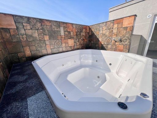 Banheira/Spa para 06 pessoas, com 06 pontos de hidromassagem aquecidos, filtro com temporizador para limpeza automatizada da água do Spa, chuveiro externo.